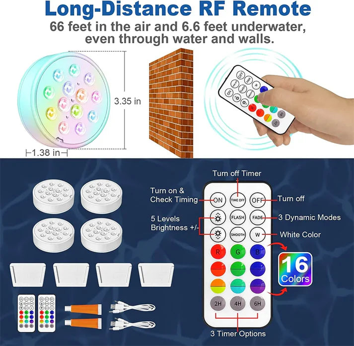 – Wiederaufladbar : Eingebauter 2300 mAh-Akku mit USB-Aufladung, der nach einer schnellen Aufladung von 90–120 Minuten 20–60 Stunden Nutzung bietet. – Vielseitige Verwendung : Geeignet für Duschen, Badewannen, Aquarien, Vasen, Wasserfälle, Garagen und Außendekoration. – Feste Befestigung : Haftet sicher auf glatten und unebenen Oberflächen. – 16 Farboptionen : Bietet 16 Farben, 3 dynamische Modi (BLITZ, VERBLASSEN, GLATT), 3 Timereinstellungen (2 Std., 4 Std., 6 Std.), 5 Helligkeitsstufen und Speicherfunktion. – IP68 wasserdicht : Vollständig wasserdichtes Design für sichere Verwendung unter Wasser. – Ultrahell : SMD 5050-Lichtquelle sorgt für Energieeffizienz und Helligkeit. – Fernbedienung : Kabellose HF-Fernbedienung mit hoher Empfindlichkeit und Synchronisierung. – Batterieschutz : Schützt vor Überladung und Tiefentladung. – Bequemes Laden : Kompatibel mit Powerbanks oder Handy-Ladegeräten für einfaches Aufladen.