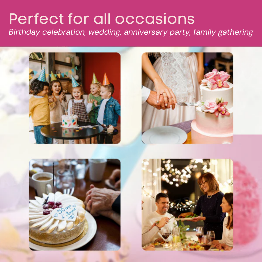Perfekt für alle Anlässe: Ob es sich um eine Geburtstagsfeier, einen Hochzeitsempfang, eine Jubiläumsparty oder ein zwangloses Familientreffen handelt, mit diesem Set können Sie Torten kreieren, die das Herzstück jeder Veranstaltung werden. Ihre Desserts werden bei jedem, der sie sieht (und schmeckt), einen bleibenden Eindruck hinterlassen.