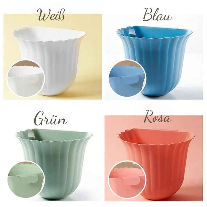 Der montierte Mülleimer hat ein vertieftes Hakendesign, das sicher über Türen und andere aufhängbare Paneele gehängt werden kann. So können Sie Türen schnell oder ruckartig schließen und öffnen, ohne dass er sich seitlich bewegt oder abrutscht. Kein Problem, da der Haken auch dünn genug ist, um ungehindert aufgehängt zu werden . Geeignet für Küchenschranktüren, Schlafzimmerschubladen, Büroschubladen, Schubladen im Kunstraum, Küchenspülen, Vorratstüren, Badezimmer und dergleichen. Dieser montierte Mülleimer hat eine schöne blumenähnliche Form, die jede Inneneinrichtung stilvoll ergänzt. Er kann sogar als einzigartiger Präsentationsbehälter oder Aufbewahrungskorb für Blumen, Utensilien, Kunstmaterialien, Obst, Gemüse usw. verwendet werden.