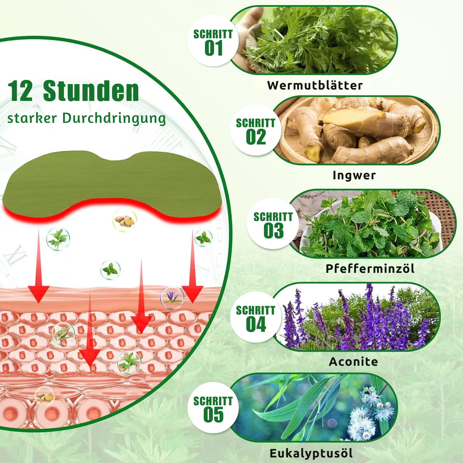 🌿 100 % natürliche Inhaltsstoffe – Hergestellt aus Kräuterextrakten wie Menthol, Kampfer und Arnika für eine sichere und wirksame Schmerzlinderung.