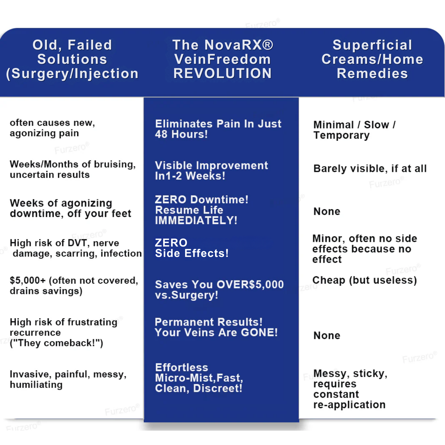 We know you've been burned by false promises and ineffective treatments. That's why we’re confident to show you, side-by-side, why NovaRX® VeinFreedom is the definitive solution, designed to meet the exact needs and frustrations we've heard from thousands of sufferers like you: