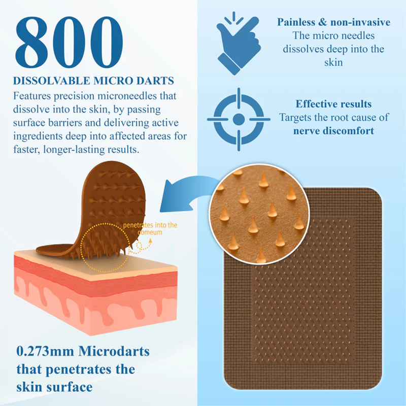 NovaRX® NumbEase Neuropathy Recovery Patch uses dissolvable microdarts to create over 800 microchannels, allowing its concentrated serum of Lidocaine and Capsaicin to reach deep into affected nerve tissue.