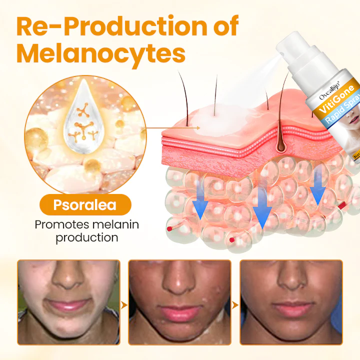 Oveallgo® VitiGone Rapid Spray is developed with exclusive Quantum-Targeted Penetration Technology, enabling bioactive herbal ingredients to cross lipid membranes and reach the basal epidermis. This process reactivates melanocytes, regulates immune activity, and repairs damaged skin cells, providing an effective approach to vitiligo management.
