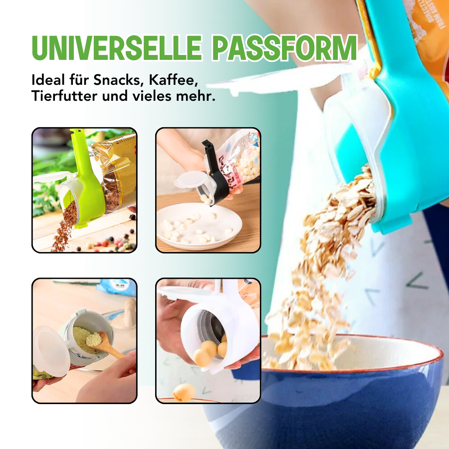 Sie brauchen den Clip nicht zu entfernen! Mit der 2 Zoll breiten Tülle können Sie Müsli, Chips oder Mehl ausgießen, ohne etwas zu verschütten.