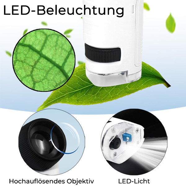 Das tragbare Taschenmikroskop für Kinder ist die perfekte Kombination aus Bildung, Spaß und Komfort. Es ermutigt Kinder, ihre Umgebung zu erkunden und verwandelt Alltagsgegenstände in Lernmöglichkeiten. Mit einem robusten, kindersicheren Design und fortschrittlichen Funktionen wie LED-Beleuchtung und starker Vergrößerung ist es ein zuverlässiges, langlebiges Werkzeug zur Förderung von Neugier und kritischem Denken. Tragbar und einfach zu bedienen, ist es ideal für zu Hause, die Schule oder Abenteuer im Freien.