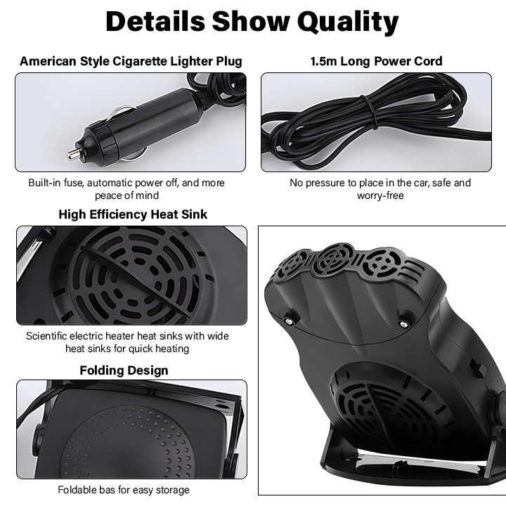I recently purchased the windshield heater, and it has been a game changer during winter and cold months! It heats up quickly, clearing my windshield in just minutes. All features are fantastic, especially the clean air feature; I can actually breathe easier in my car now. I love how versatile it is—it’s perfect for defrosting or simply warming up before driving away. Plus, it's energy-efficient, so I don't feel guilty using it. Highly recommend this product for anyone tired of scraping ice!